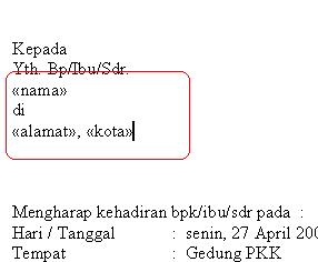 Mail merge , merupakan salah satu fasilitas yang ada pada microsoft word yang sangat berguna bagi kita ketika membuat sebuah data yang memiliki format yang sama tapi memiliki beberapa data yang berbeda dan banyak. contoh sederhana ketika kita membuat sebuah undangan. undang mempunya format yang sama, misalnya pada bagian hari, tanggal, dan acara. sedangkan data yang berbeda misalnya nama yang diundang, dan juga alamat yang diundang. seperti contoh di bawah ini.